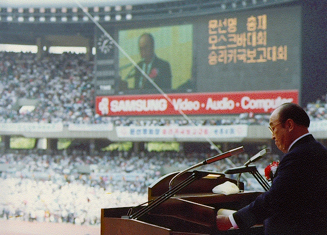 Nu har vi kommit till scenen, som är bortom den nationella standarden. Vi kan etablera det himmelska konungadömet på global nivå genom att trampa på den satanska världens konungadömen. Den dagen började den 27 mars 1990. Genom detta kan världen vända efter vinden som pastor Moon blåser.